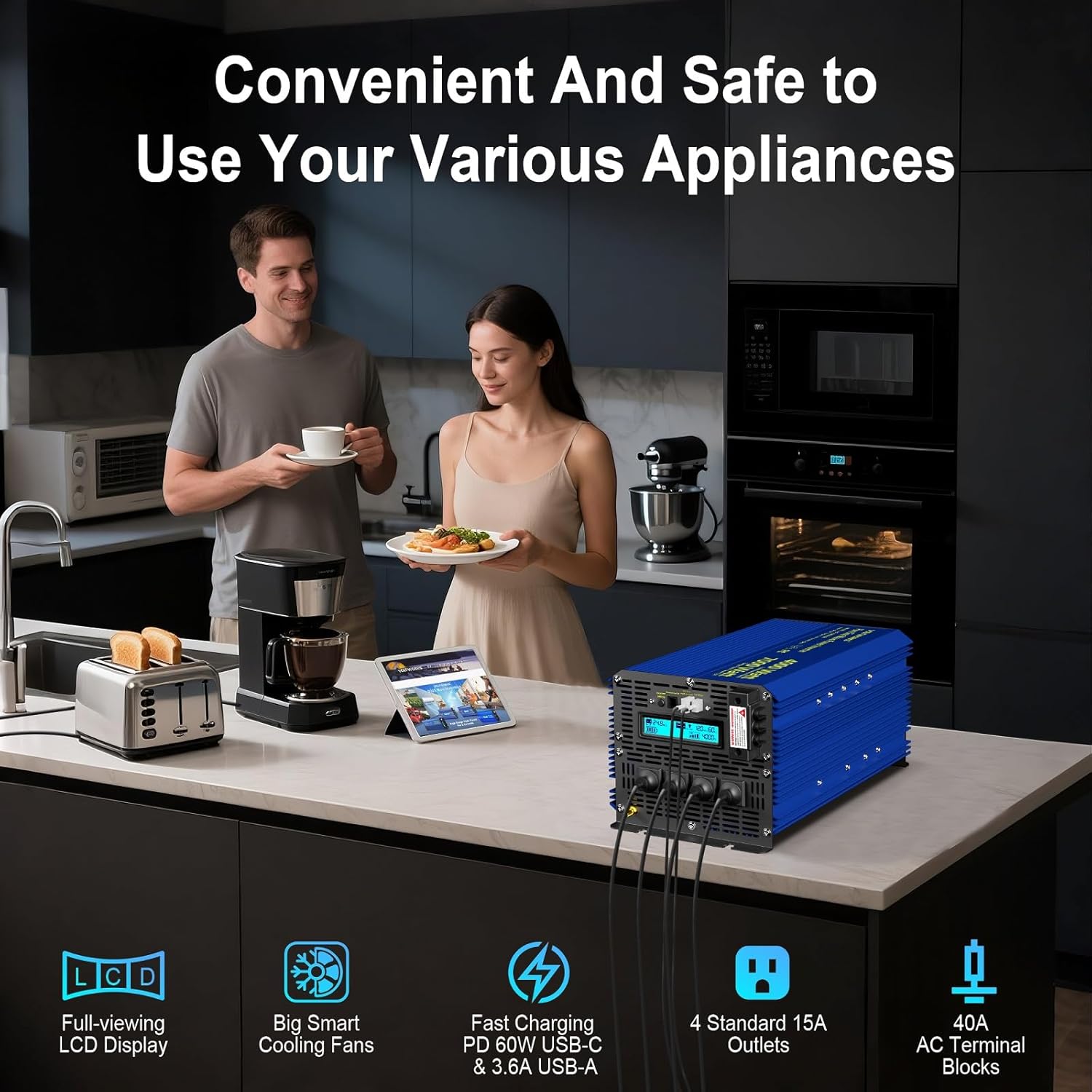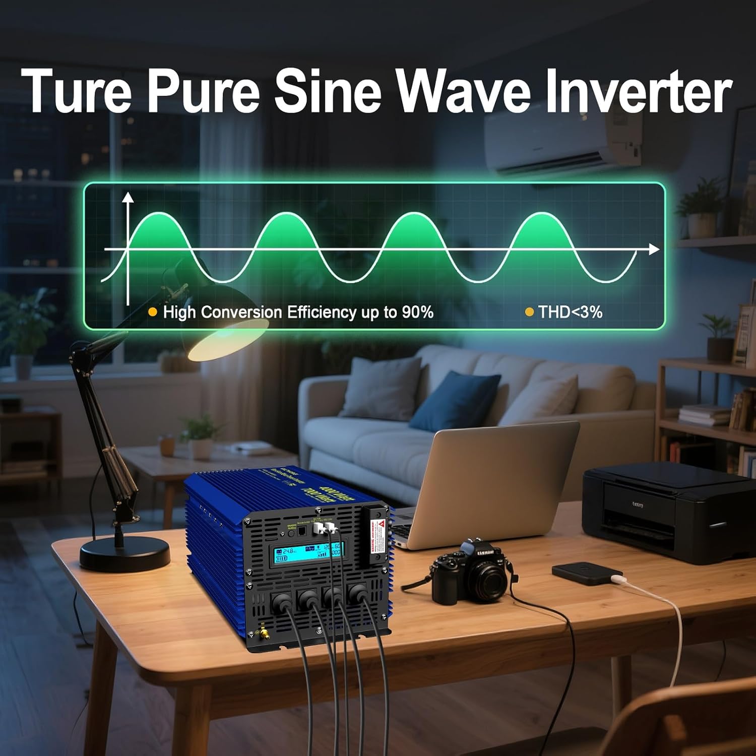 | BuiltIn Media | 1* 4000Watt Pure Sine Wave Inverter, 1* Ground Wire, 1* Wired Remote Controller with Battery Monitor, 1* Wireless Remote Controller, 4* 2FT Battery Cables (Black and Red) |