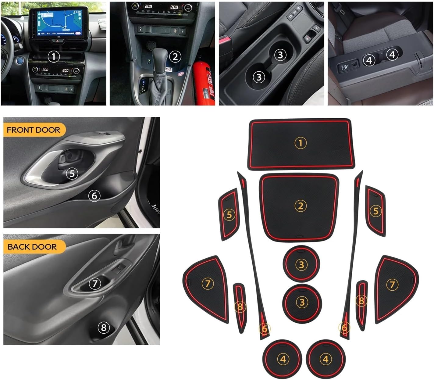 Product Description:1. Special car dedicated: suitable Compatible with 2021 2022 2023 2024 Compatible with Toyota Yaris Cross SUV left hand drive / 2020 2021 2022 2023 2024 Compatible with Toyota Yaris Cross MXPB MXPJ1 right hand drive.2. Easy to install: 14 / 17 pieces/set, corresponding position, easy to install.3. Easy to clean: If it gets dirty, you can use the handle on the mat to remove it and clean it directly.4. : Made of latex, and durable.Important Hint:Please refer to the product picture display. If you are unsure about the product, please contact us in time to inform your car model year. We will reply you promptly. thank you very much!==========: Origin : Mainland ChinaMaterial : Latex Name : Car Door Groove MatSuitable Compatible with : 2021 2022 2023 2024 Compatible with Toyota Yaris Cross SUV/2020 2021 2022 2023 Compatible with Toyota Yaris Cross MXPB / MXPJ1Dedicated to : Compatible with Toyota Yaris Cross SUV 2024 AccessoriesColour : Red/White/Black/BlueQuantity : 14 Pieces / 17 PiecesWelcome to our store! We offer a wide selection of genuine and compatible high-quality parts for various car brands. From engine components to body accessories, our professional team will provide you with precise matching suggestions, ensuring your car repair is worry-free.