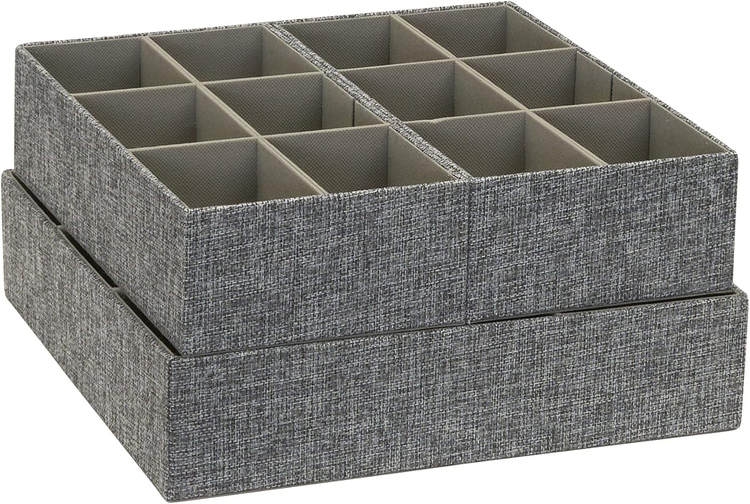 Keep all your accessories and supplies in contained, organized spaces with the use of these graphite drawer organizers. This starter set offers 1 large and 2 small organizer trays with customizable compartments and conveniently notched edges. This starter set will give you a head-start on achieving a refined and organized living space. These organizer trays offer unique versatility with their fully customizable inserts and sturdy construction. The large tray can be customized to hold up to 9 slots for detailed storage of socks, underwear and T-shirts, while the smaller trays can hold up to 6 slots for smaller accessories such as hair clips, sewing supplies, jewelry and more. These trays can be customized to create small, medium, large or long slots. All inserts can be removed to create an extra-large storage option for washcloths and other larger items as well. While other organizers remain static, these removable inserts introduce flexible organization that can adjust to your evolving storage needs. The chipboard sides provide the necessary durability for everyday use. The notched edges allow for easy insertion and removal from drawers, cubbies and shelves. The graphite polyester linen exterior is chic yet subtle, a perfect addition to decor on the bathroom counter, office desk, dresser or vanity table. The PP non-woven lining provides a durable layer of protection and prevents snagging. These trays can also be nested for compact storage. These drawer organizers offer a great starting point for anyone looking to upgrade their storage in the bedroom, office, bathroom or living room. These organizer trays will keep your drawers tidy by keeping items contained, organized and protected. The extremely versatile customization of these organizers makes them perfect for anyone with ever-changing storage needs. Large: 12.6" H x 12.6" W x 3" D; small: 6" H x 12" W x 3" D.