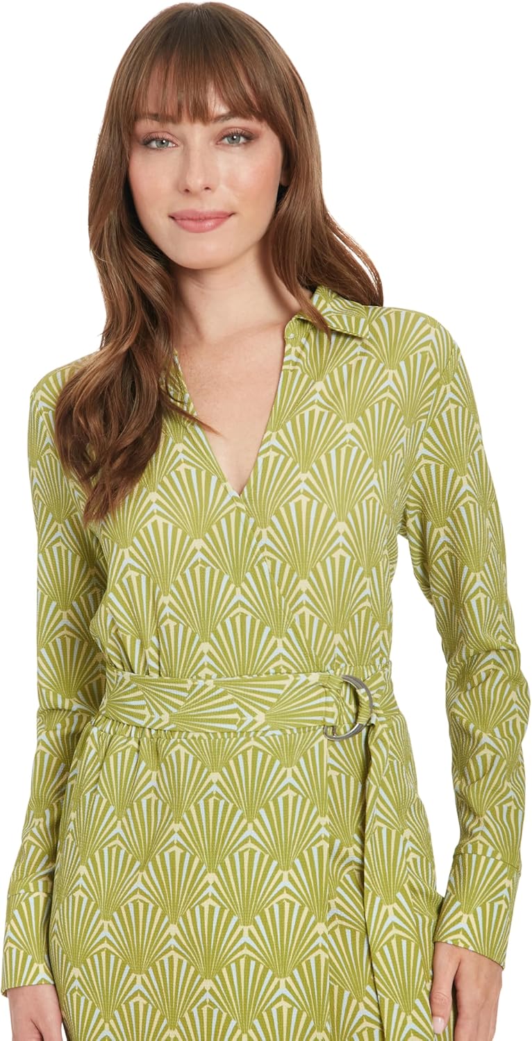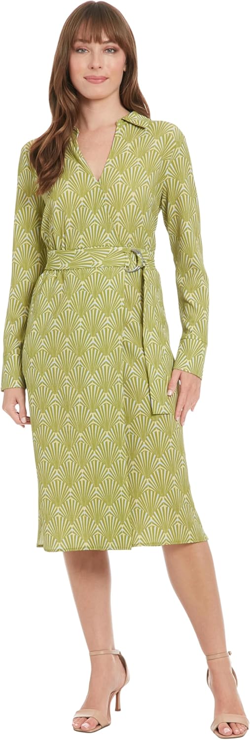 Perfect wrap dress, business casual dress, and long sleeve dress featuring a midi-length silhouette with self-tie belt at natural waist, structured collar, straight hem below knee in lightweight, smoothly draping fabric