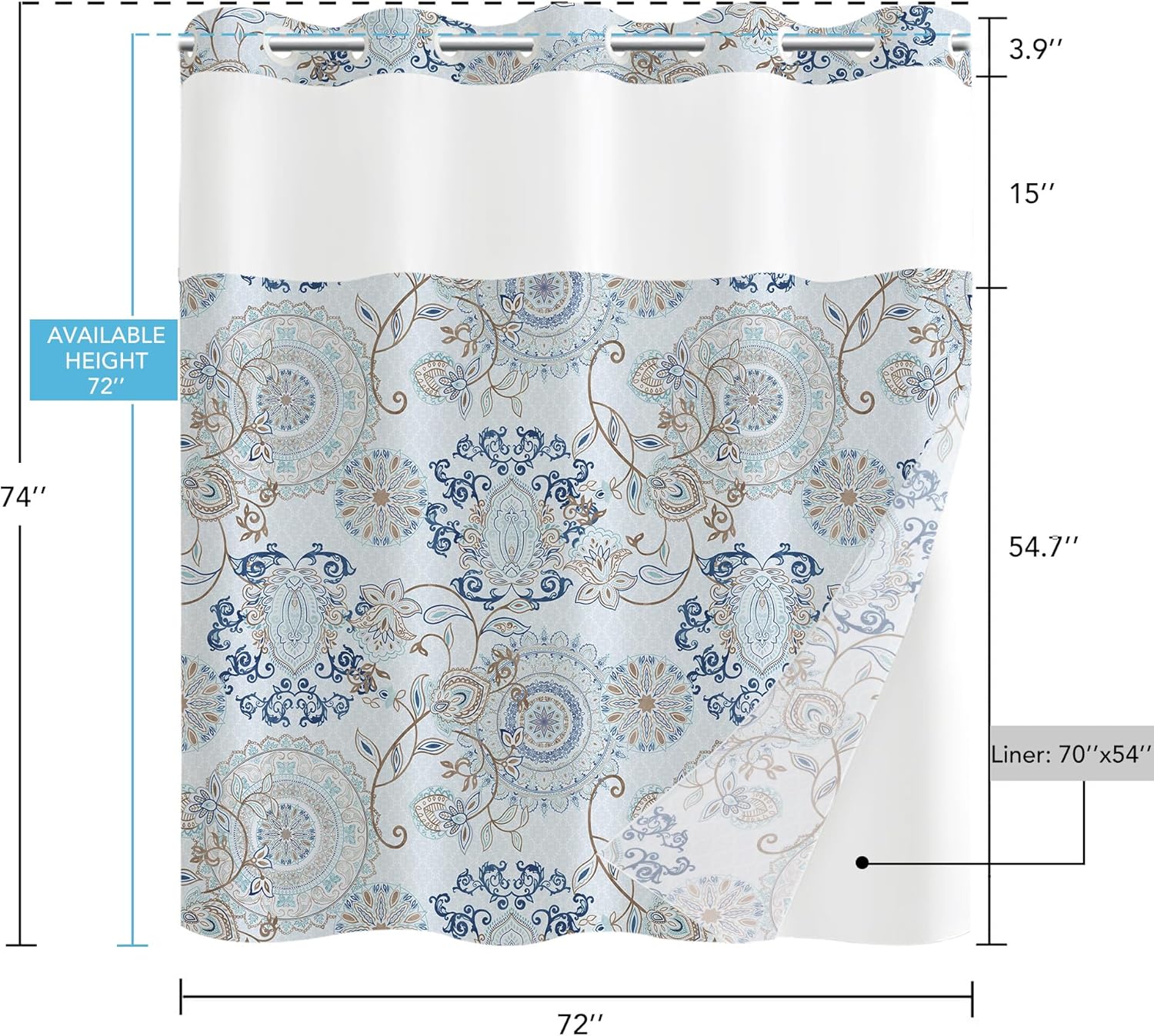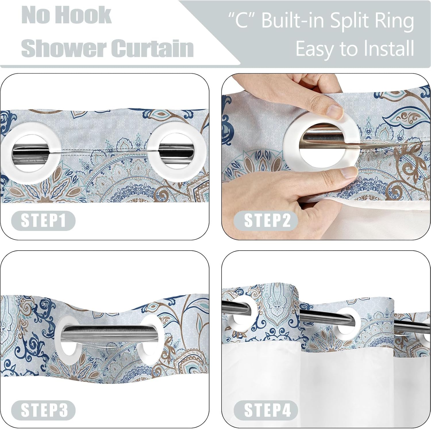 Create a Tranquil and Refined Retreat. Bring timeless elegance to your bathroom with the Neasow Light Blue and Navy Paisley Floral No Hook Shower Curtain. This sophisticated pattern, blending classic paisley with delicate florals, creates a serene and graceful atmosphere that makes your daily routine feel like a peaceful escape.A Beautiful and Practical Dual-Layer System. Our smart design features a graceful outer fabric curtain that adds a touch of class to your space, and a separate, waterproof inner liner that’s easy to remove and replace. This system ensures your curtain looks beautiful and performs flawlessly for years to come.Hassle-Free Installation & Secure Design. Installation is effortless with our exclusive "Split Rings." You can hang this curtain in seconds without hooks or extra effort. The magnetic weights at the bottom ensure the curtain stays in place, keeping water inside the tub and your bathroom floor perfectly dry. Elevate your decor with this beautiful, functional, and effortless curtain.NoticeDimensions: The curtain is sized to fit most standard bathtubs and showers.Package: Each package includes one decorative outer curtain and one replaceable inner waterproof liner.Color Disclaimer: Please note that the actual product color may vary slightly from the images due to different screen settings and lighting conditions.Size Tolerance: Dimensions are measured manually and may have a slight variation.