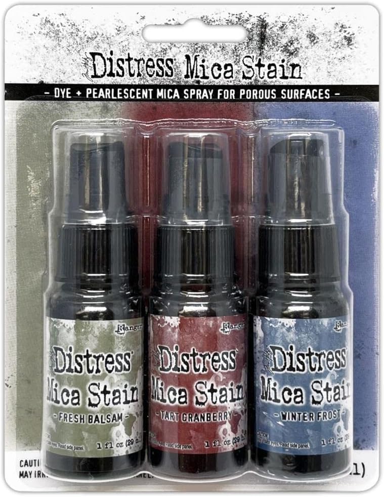 Tim Holtz 2022 Holiday Mica Stains Sets #3 and #4 and Holiday Snowfall Grit Paste - Limited Edition - 3 Item Bundle. The Mica Stains are translucent pearlescent sprays that add color and shimmer to paper, canvas, wood, fabric, and other porous surfaces. Use as a finishing spray or layer over inks and paints to create luminous effects and backgrounds. Each set contains three 1oz bottles, for a total of 6 bottles. Bundle also contains one 3 ounce bottle of Distress Grit Paste - Snowfall: Snowfall Grit Paste is a dimensional translucent medium infused with a clear glitter that dries to a textured sparkle finish.